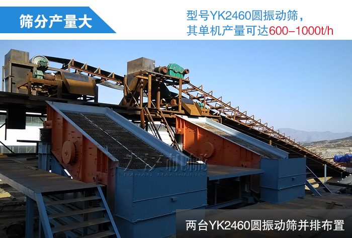 型號YK2460圓振動篩,其單機(jī)產(chǎn)量可達(dá)600-1000t/h,在時產(chǎn)2000噸的鐵礦石生產(chǎn)線中,兩臺YK2460圓振動篩并排布置,便可輕松達(dá)到生產(chǎn)線篩分產(chǎn)量要求,篩分產(chǎn)量是非??捎^的。